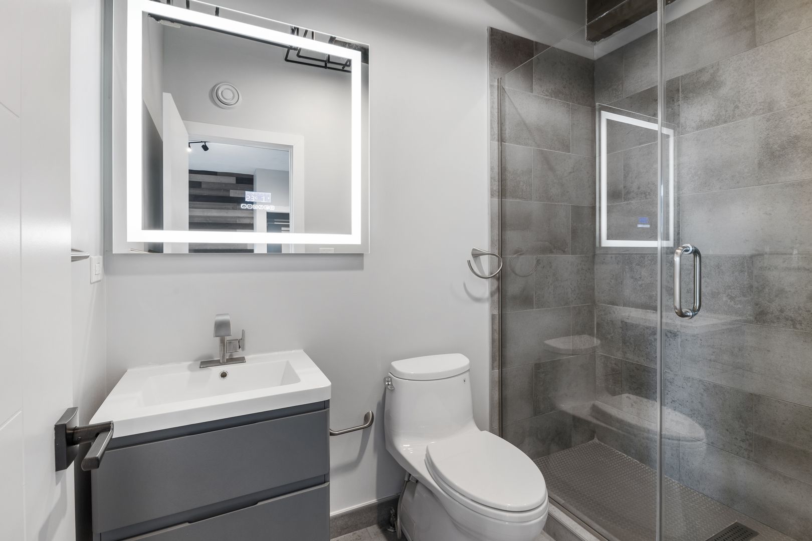 —Sleek Bathroom with LED Bluetooth Speaker Mirror