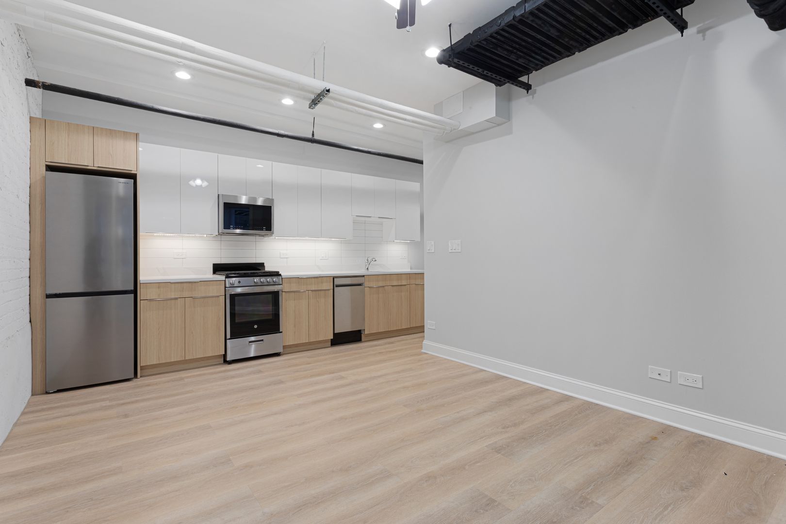 *Gourmet Kitchen: Cook and entertain in a bright, light-filled kitchen boasting two-toned cabinets, sleek quartz countertops with a deep undermount sink, and a full suite of stainless steel appliances (including a dishwasher!).