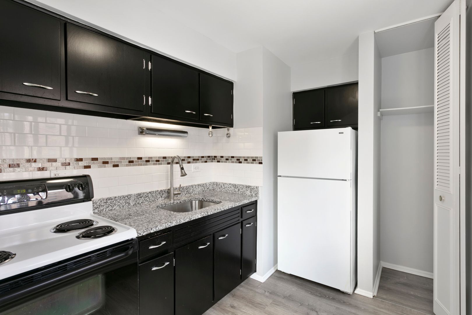 *Sleek Kitchen: A modern space featuring dark-toned kitchen cabinets, durable granite countertops with a deep undermount sink, and clean white full-size appliances. There's a designated eat-in kitchen area for dining.