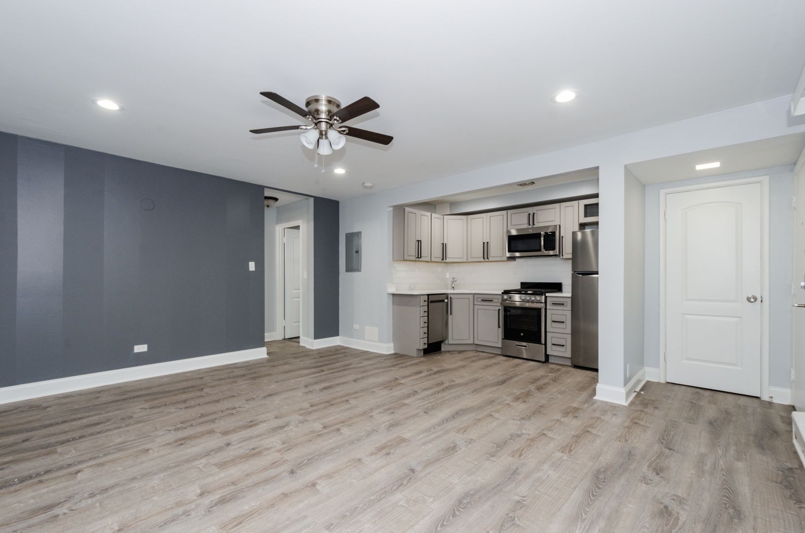 *Sleek Kitchen: The modern kitchen is equipped with stylish modern gray kitchen cabinets, elegant quartz countertops featuring a deep undermount sink, and full stainless steel appliances, including a dishwasher.