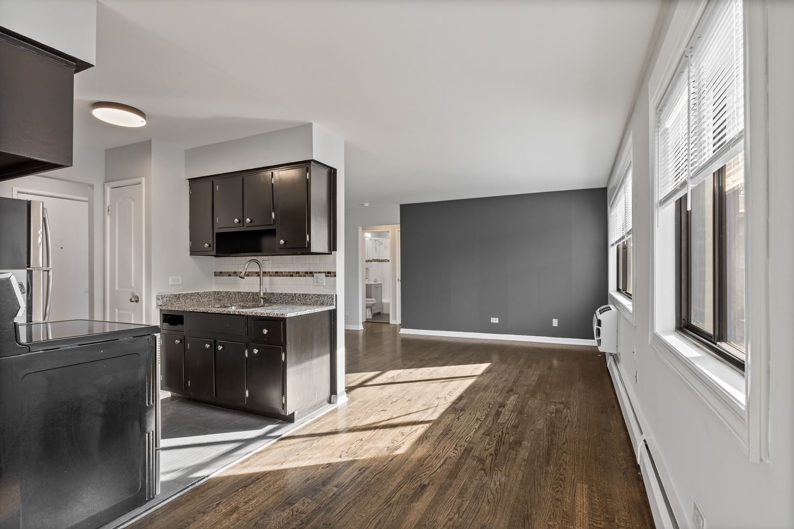 Discover your perfect home in West Ridge with this beautifully updated 1-bedroom apartment. Featuring dark-toned wood kitchen cabinets, stainless steel appliances, and stunning granite countertops with a deep undermount sink, this kitchen is both stylish and functional. The spacious living room, which includes an attached dining or office area, is perfect for relaxation or productivity.